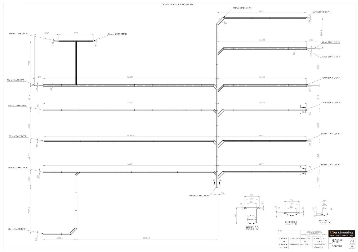 LS Engineering have recently completed the manufacture and installation of a drain project for one of our clients with light weight heavy duty removable GRP drain grid Tops. The Run consisted of 1 central channel with 10 contributaries of varying widths totalling 230 metres with an end depth of 380mm (please see below G.A.). Getting the falls to work based on the depth of the end discharge was certainly a challenge however our skilled team (from design to install) delivered the project on time and within budget.