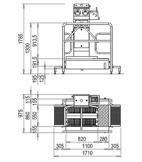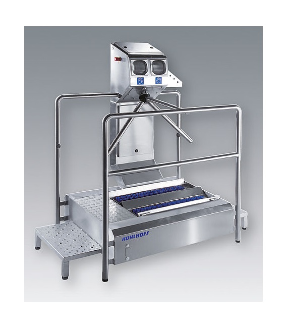 - The horizontally mounted rotating brushes covered by a fold-out floor grating made of stainless steel ensure the fast cleaning of the soles. The Brushes can be adjusted to run from 1 – 10 seconds.