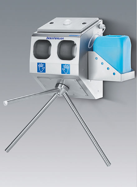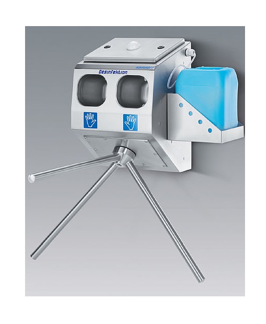 After successful hand disinfection the turnstile is unlocked and then the turnstile locks for the next use.