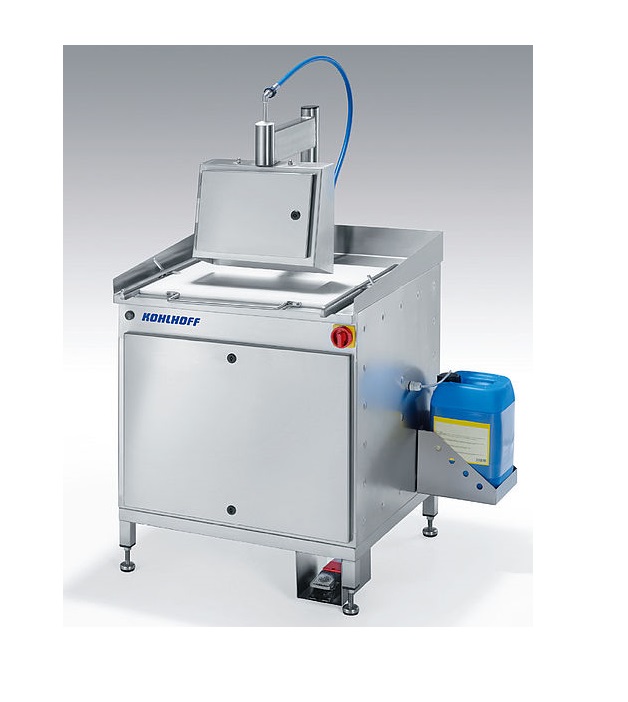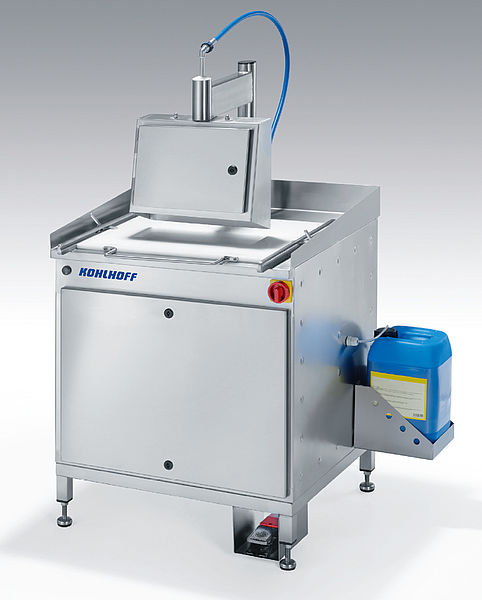 Apron Cleaning Machine has a high pressure water spray is activated using a foot valve, and is automatically supplemented with a cleaning agent or disinfectant.