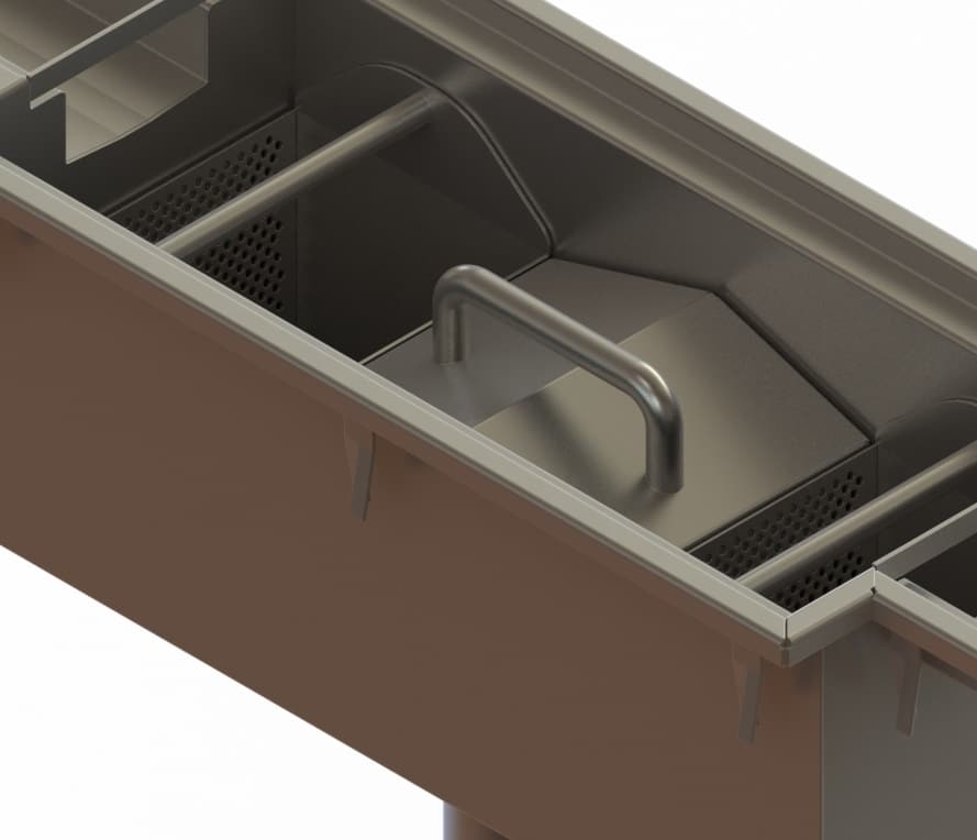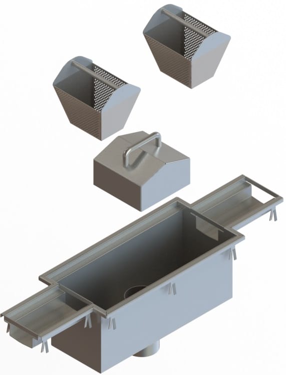 - Introducing our Standard Central Bottom Drain Outlet suitable for all industries. Manufactured from 304 or 316 Grade Stainless Steel these drain outlets are fully welded and manufactured in standard sizes and positioned along the length of a drain channel in a central position of the drain channel, equipped with a fully removeable trap to provide rodding access. Complete with two removeable baskets.