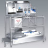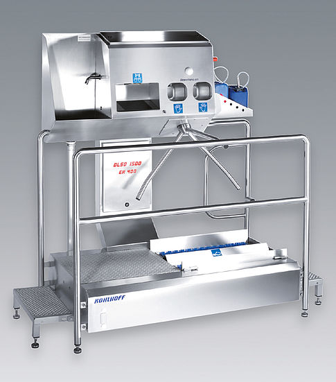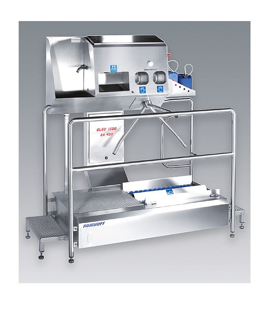 - The machine consists of a step, sensor operated sink with integrated soap and hand dryer to ensure optimum hand cleaning leading on to the brushes for soles.
