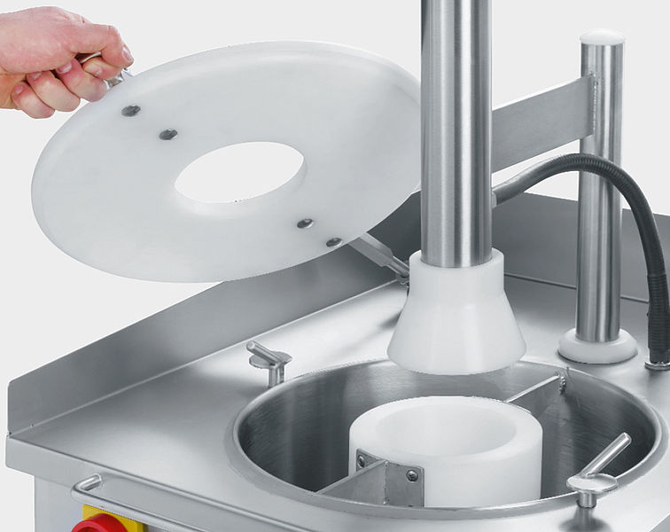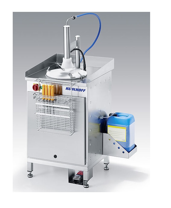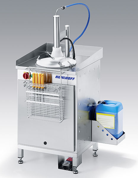 This reliably cleans and disinfects even extremely dirty chain gloves in max. 15 seconds. The high pressure water spray is activated using a foot valve, and is automatically supplemented with a cleaning agent or disinfectant.