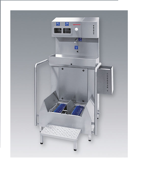 The hygiene centre can be attached to a traffic light control, a door release mechanism or mechanical turnstile, thereby ensuring the compulsory cleaning and disinfection of hands and the soles of shoes.