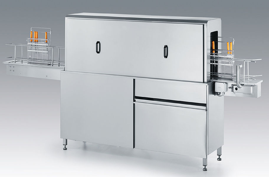 - A sensor automatically starts Knife Basket Cleaning Machine when the knife baskets are placed on the conveyer belt. The baskets are first intensively washed with hot water at about 45 °C with cleaning agent being added.