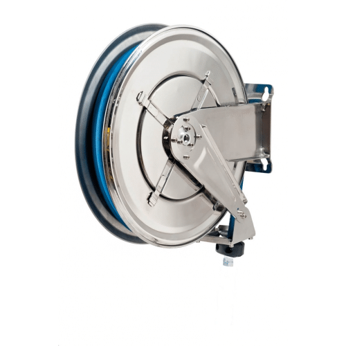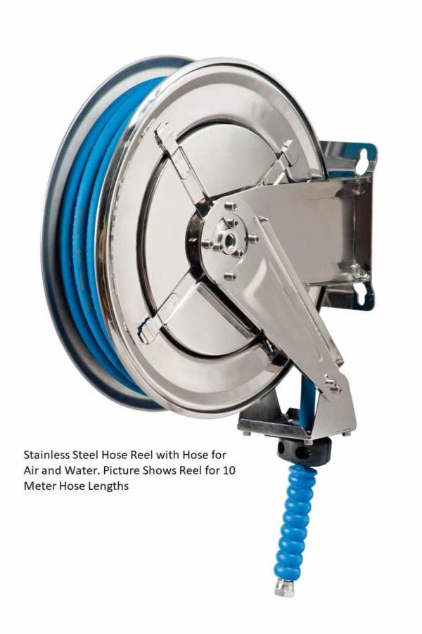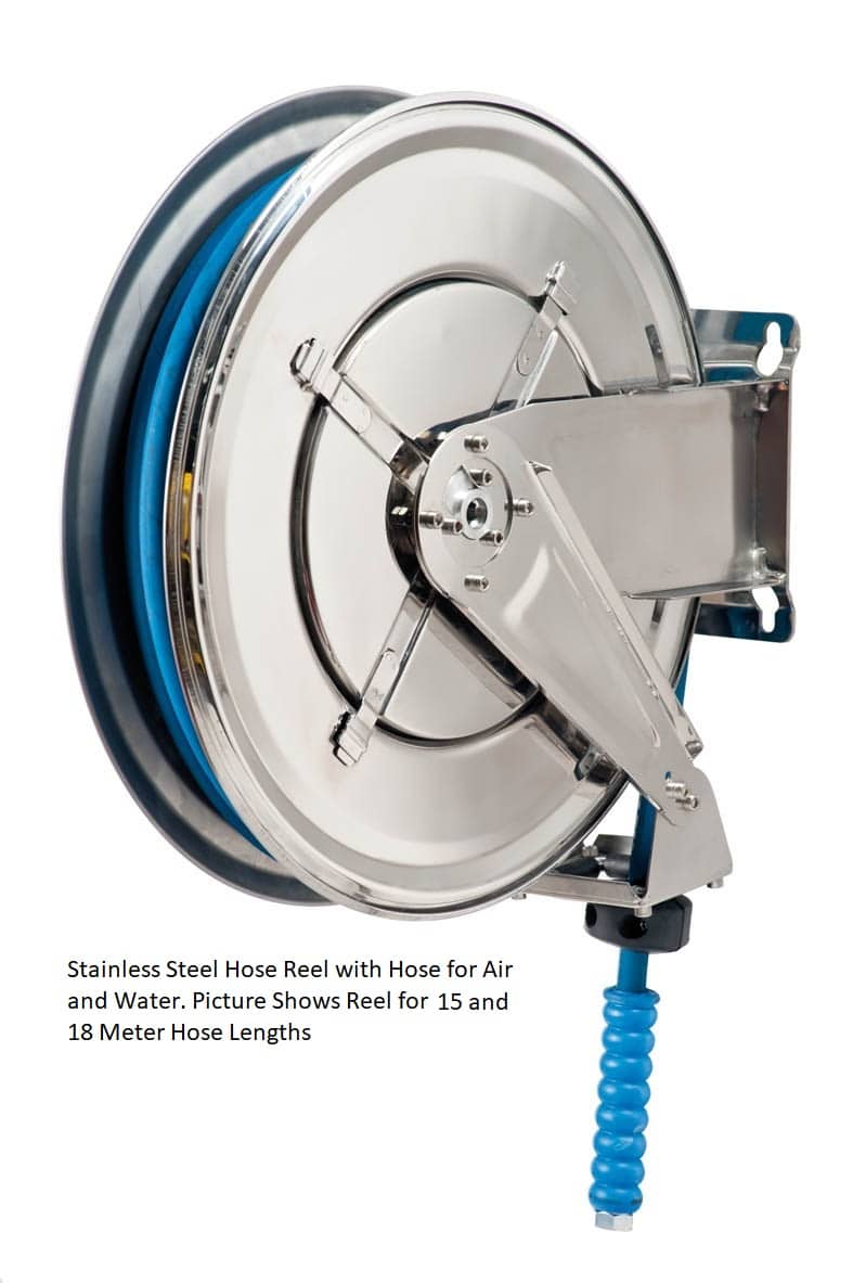 Reelcare Stainless Steel Air or Water Hose Reels are highly resistant to chemicals and salt water corrosion. They are popular in the Food and Pharmaceutical industries and are extremely hygienic.
