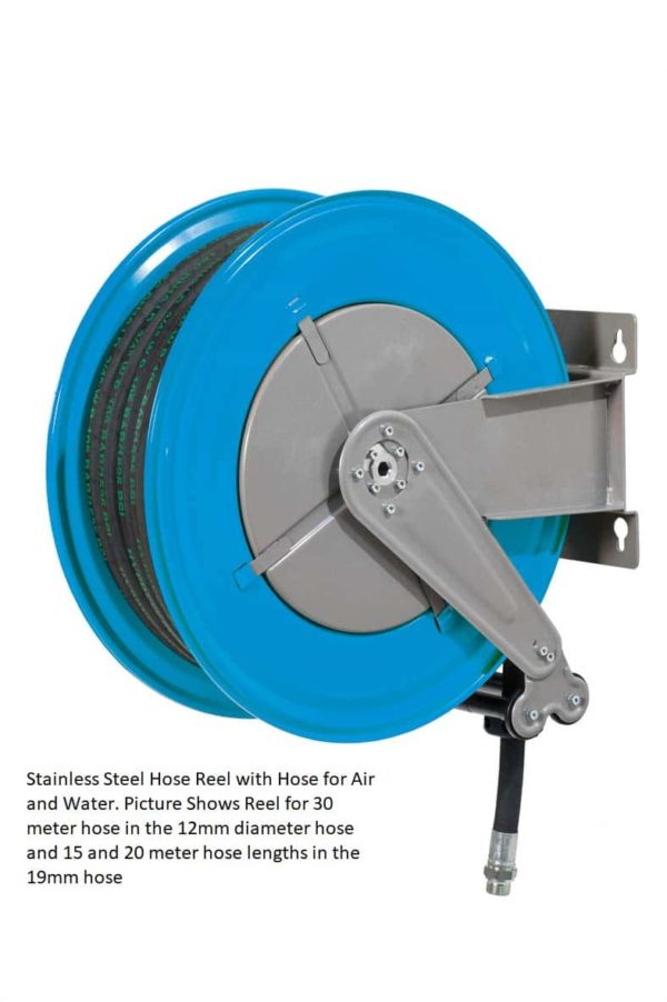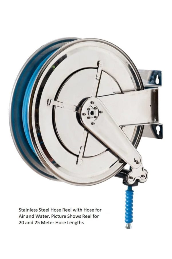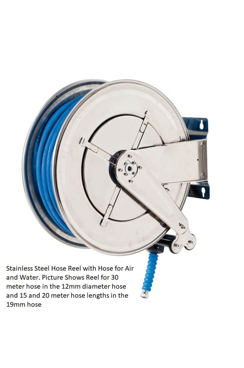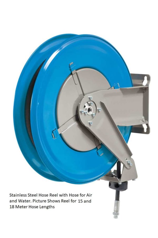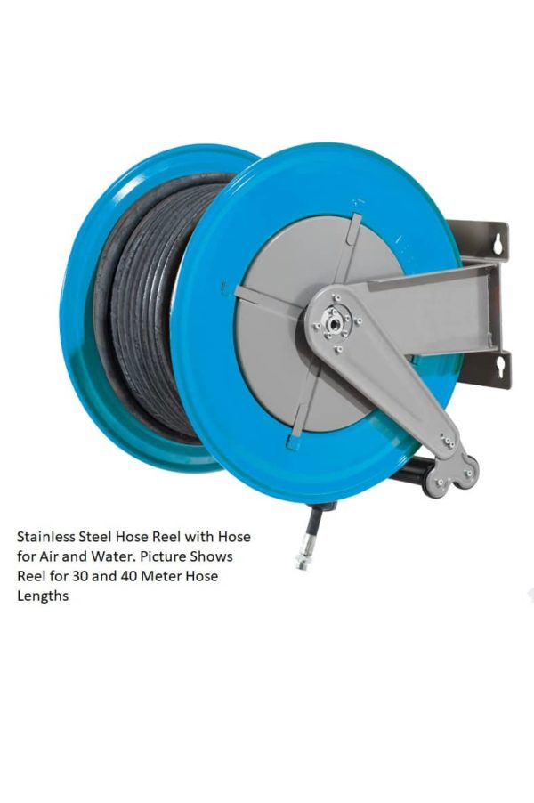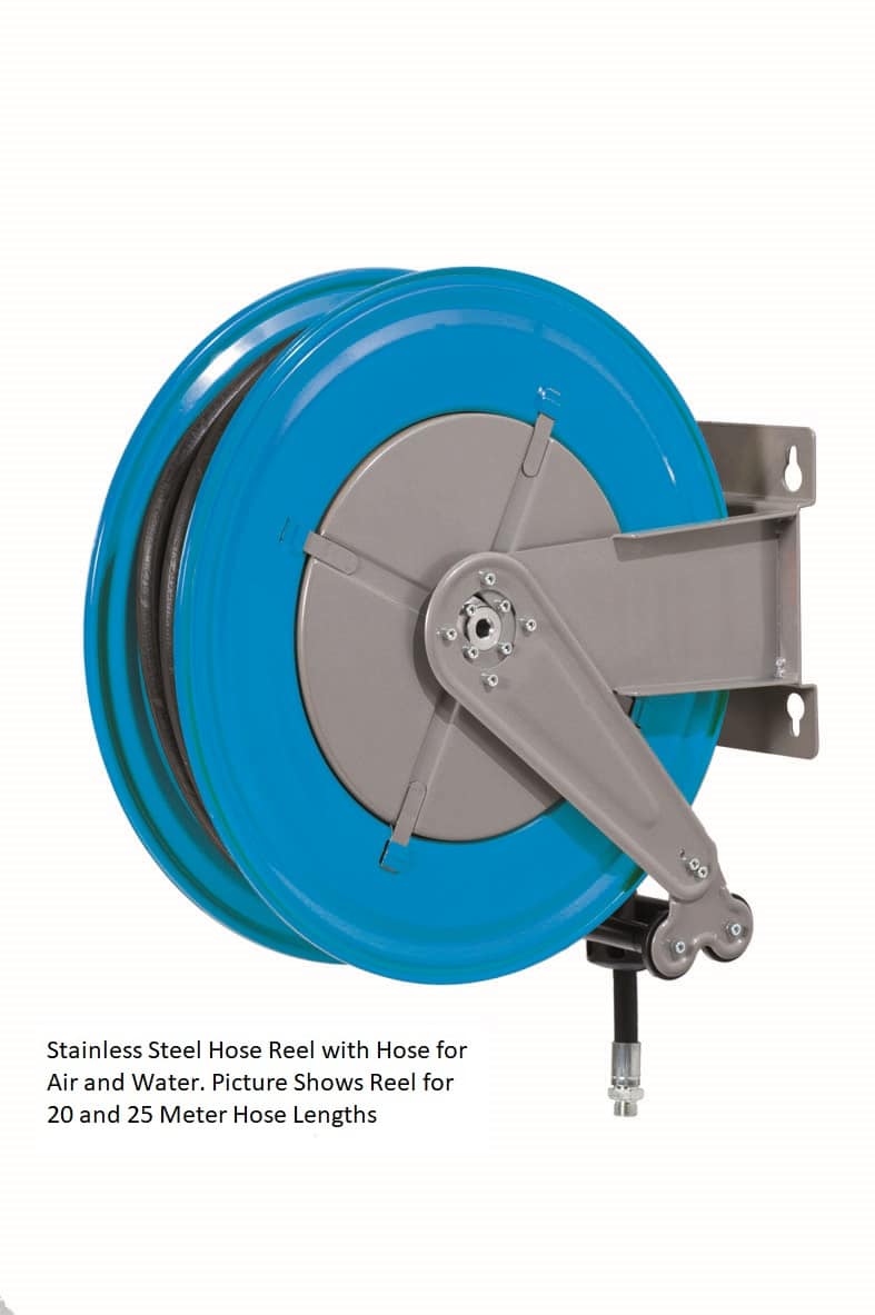 Our Stainless Steel Air and Water Hose reels are supplied with hose bumper stoppers and four way nylon rollers.