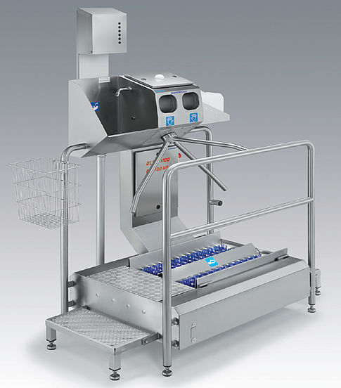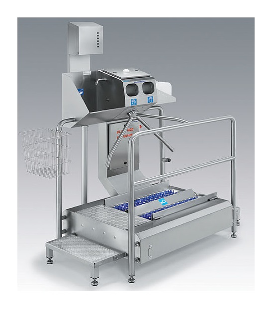 Our walk-through Sole Scrubbing Hygiene Station with hand wash basin, hand sanitiser and turnstile is designed for optimal cleaning of shoe soles and hands whilst adhering to a high degree of safety by the enforcing the passing of personnel through all hygienic controls.