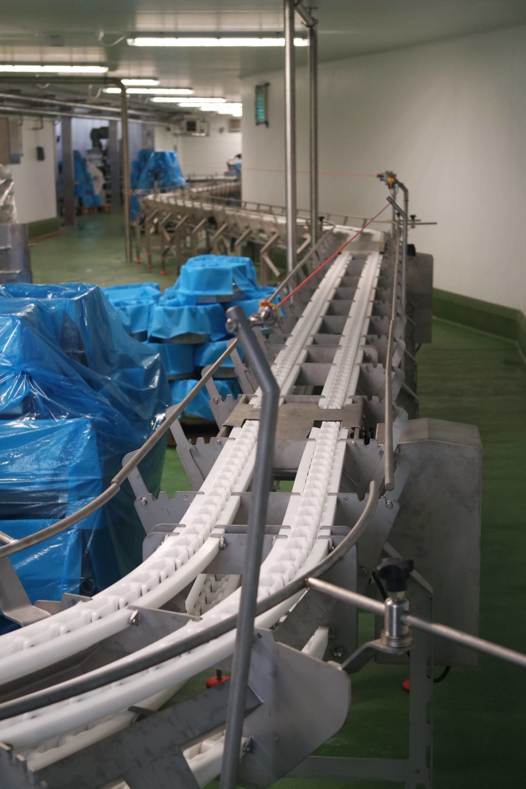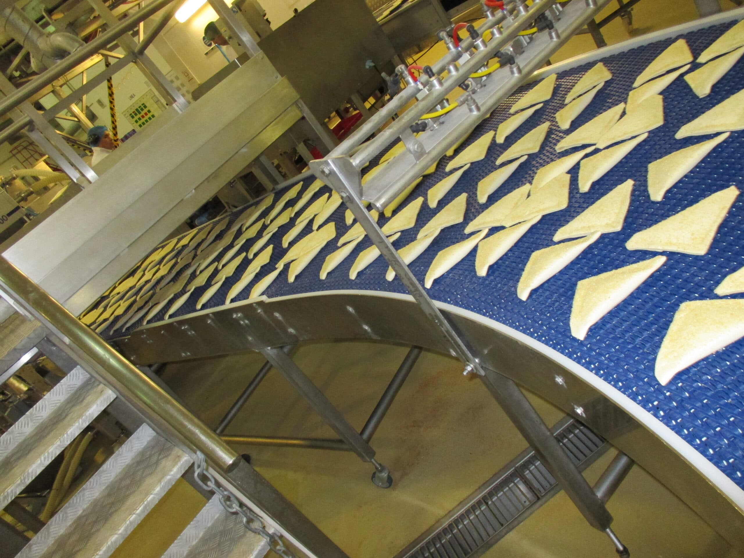 The idea of a Stainless Radius Conveyor is to take the produce from a straight around a 90 degree corner to another straight to its desired location.