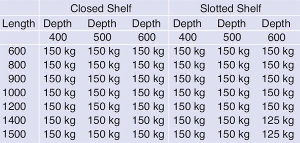 Depending on the design and the choice of the upright, the shelving system is available with a shelf load of 600 kg or 1200 kg. The maximum shelf load can be calculated by the sum of the separate shelf loads per section.