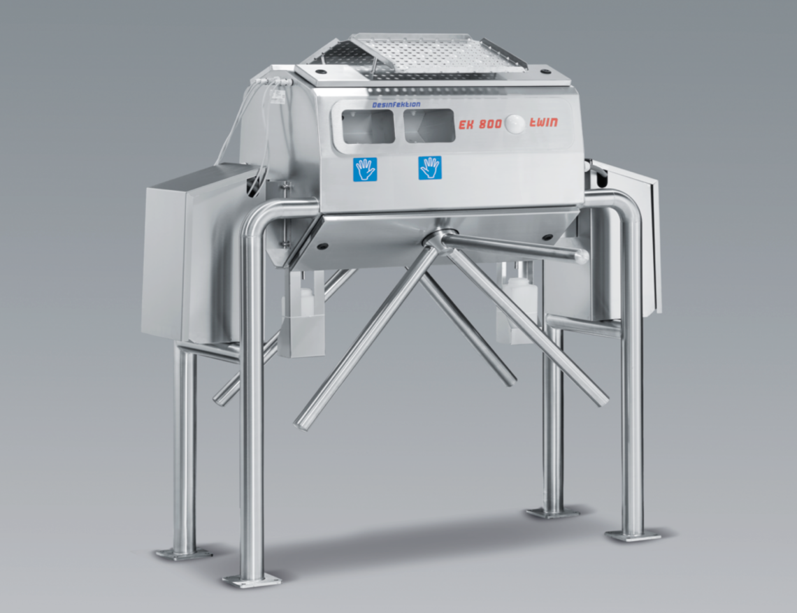 The Twin Entry Control Turnstile EK 800 TWIN is a two lane facility and guarantees a safe disinfection of hands through the tamper-proof two hand disinfection in connection with an – after successful hand disinfection unlocked – turnstile lock in both lines.