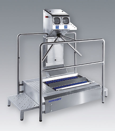 - The horizontally mounted rotating brushes covered by a fold-out floor grating made of stainless steel ensure the fast cleaning of the soles. The Brushes can be adjusted to run from 1 – 10 seconds.
